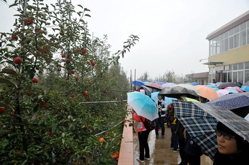 尽管今天下着蒙蒙细雨,却丝毫不影响同学们激动的心情,经过近两小时的车程,我们来到了宝鸡市千阳县苹果试验站。一进站,同学们就被细雨中满眼硕果累累的果树震撼了!大家还没从满目的深红、翠绿没缓过神来,试验站的老师们已经给每伟同学发了一个新鲜采摘的苹果,让大家品尝起来!眼前所看,嘴里所尝,让我们的心都醉了!