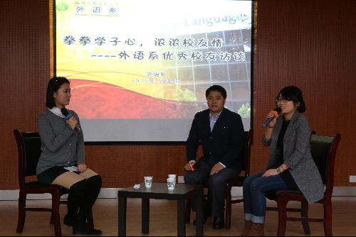 为更好地促进我系优良学风建设,增强外语系学子凝聚力和荣誉感,解决学生学习发展中的困惑,12月4日晚,外语系专门邀请到了两位优秀校友范洪军和胡晨浔参加访谈。全体学生参加会议。