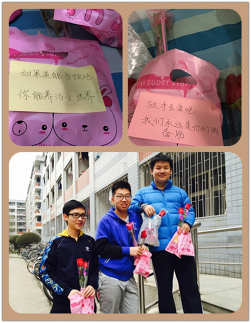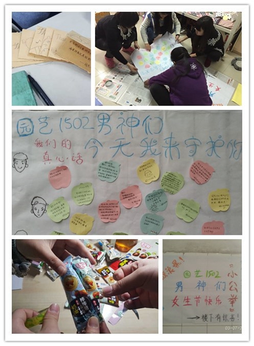 在这个专属于女生的节日里,各班男生绞尽脑汁为女生们带来了贴心的服务:园艺1503、1505等班级男生提前收集了女生们的愿望,在这一天让她们梦想成真:新的鼠标送来了、想要的盆栽买到了、美味蛋糕也吃到了……一个个愿望搭建起男女生之间沟通的桥梁,拉近了彼此之间的距离,加深了彼此的感情。 设施1502班的班委在这一天为班上可爱的七位女神每人带来了一支玫瑰花、一张写满真挚话语的便签以及一份神秘小礼物。园艺1504班的男生在这个特殊的日子里,特意为班上所有女生打热水。一壶壶热水,满载着男生对女生的关怀,也在不经意间温暖了每个女生的心。谁说只有玫瑰花才能体现出对女生的赞美和关怀?日常的帮助更加凸显出大家的细心与体贴,也更加彰显出彼此之间的同窗情深。