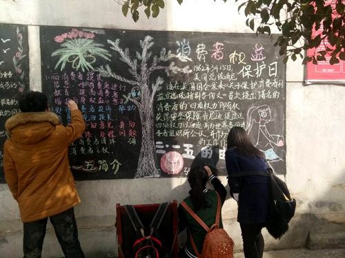 宣传队同学们进了村口以后兵分两路,分别以发放传单和制作专题宣传海报的方式形式进行宣传。在发放传单的过程中,同学们主动且耐心的向村民讲解传单上的相关知识。而制作宣传海报的同学们经过精心的策划,将消费者权益的一些相关知识,通过图文结合的设计方式展现在了村口的宣传板上。不断地有村民走过来停留在黑板前观看,制作海报的同学们也是积极的向村民们讲解黑板上的相关内容。