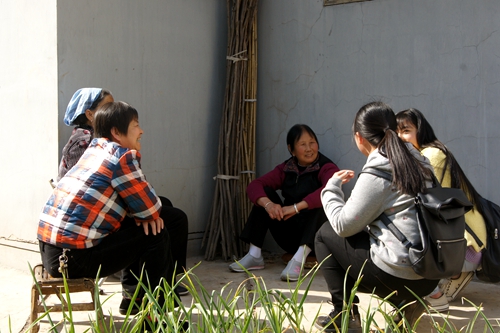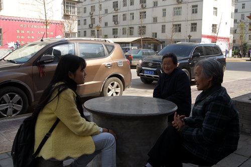 活动中,志愿者们与社区老人们聊天谈心,帮助他们打扫卫生、清理菜地杂草。在与老人聊天时,志愿者们询问了居民们的居住、饮食、医疗卫生及教育等基本生活情况。交谈中,志愿者们了解到:温馨家园小区是由三个村庄在6年前合并组成,由于合并之后居民不再耕种土地,所以小区居民的收入主要依靠子女外出打工所得,小区内基本上都是老人和儿童,老人们平日里主要是照顾小孩,有些老人还通过担任环卫工人来补贴家用,有的老人则在小区的空地上开垦出一片菜地,种上各种各样的菜来供大家分享,社区之间邻里非常和睦。