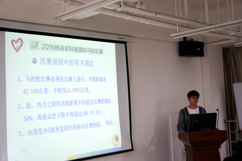 为了更好的做好2016年杨凌国际马拉松志愿者服务工作,充分展示我校青年学子的青春风采,我院于3月30日晚在理科楼E334举行了志愿者培训会,理学院全体志愿者参加了此次培训。 首先,我院志愿者第一小组组长计小伟同学对此次马拉松的比赛时间,地点及赛事流程进行了详细地介绍,并通过图解给同学们介绍了在网上注册志愿者的程序和相关要求。第二小组组长石行带领大家学习了此次国际马拉松志愿者服务指南,内容涉及志愿者的礼仪规范、权力义务、急救知识、注意事项等。最后,由去年杨凌马拉松的几位志愿者给大家一一的分享了各自的志愿心得。