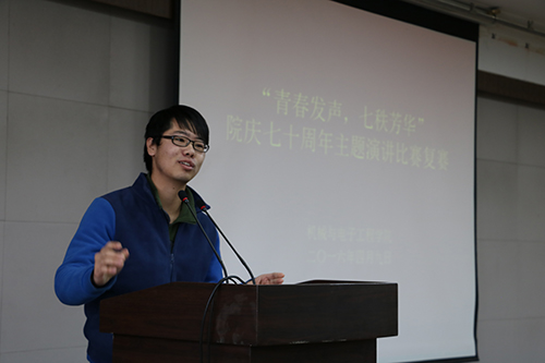 比赛由电信121董全章带来的“我的大学生活”拉开帷幕。作为一名大四学生,在距离离校只有不到百天的日子里,心里更多的是感伤与怀念。通过他的精彩演讲使机电学院新一代莘莘学子明白了一定要珍惜现在,把握当下。机制131刘佳梁特别准备了配乐,在动听的音乐中为大家带来“一颗流星一个你”。机电143江琳为学生讲述了学院悠久、厚重的历史。她庆幸在自己还未离开西农,未挥手机电的时候迎来了学院的古稀之年,并借此对学院表示庆贺与祝福。最后,电信1502张鑫宇为全体老师、同学带来“最好的我们”。她将心中的理想与脚下的现实相对比,将专业的选择与就业的趋势相融合,为学生讲述了作为大一新生普遍存在的矛盾心理与生理,得到了一致的认可与鼓励。