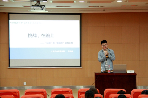 为营造创新创业氛围,提高大学生创业实践能力,向优秀毕业生学习如何平衡兼顾学业和创业创新,5月23日晚,由校团委主办、人文社会发展学院团工委承办的优秀毕业生交流会在北绣北报告厅举办,于晓康学长应邀为大家带来题为“挑战,在路上——‘科创’与‘挑战杯’故事会”的报告。近百名同学聆听了此次报告会。
