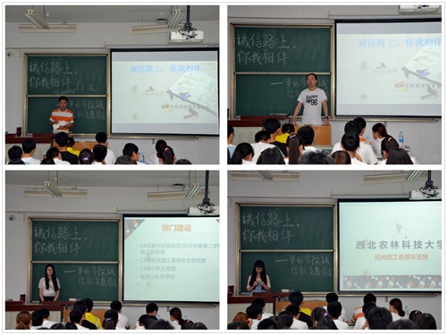 大会伊始,阳光团工委副书记张斌就阳光团工委简介和上一年度的工作总结作了发言。阳光团工委在过去一年里组织开展了多次义务活动,其中实践部支教活动尤为出色,仅我院参与人数就已达全校半数。最后,她以口号“资环有我,有我有爱有阳光”结束发言。随后,阳光团工委资环支部新任书记刘依介绍了支部的管理条例和未来的工作设想等,新任副书记王静发表了就职感言。