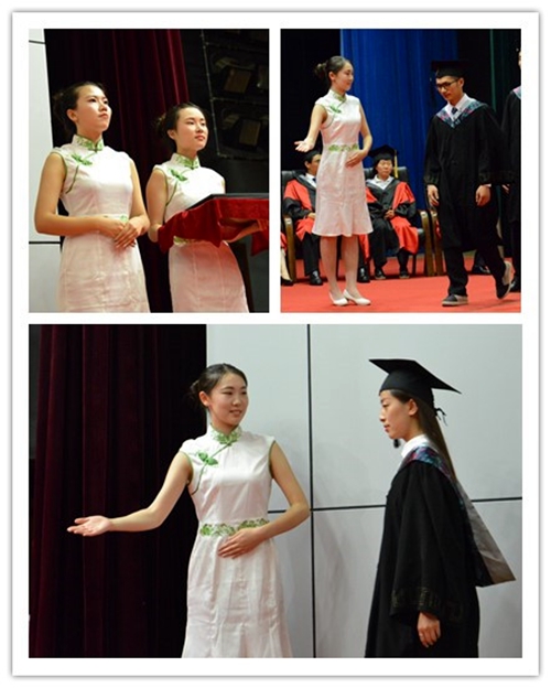 “参加如此隆重的仪式,不光是我们,连学姐学长都有些紧张。”礼仪队的领队尹雪莹如是说。孙校长为毕业生拨穗后,毕业生中有人会与校长和学术委员会委员拥抱、合影留念,他们中也有紧张到学位帽掉落的,有忘记了流程,领完学位证书后朝后台走去的,每当他们出错的时候,礼仪们都会为他们指引。每一位礼仪都用最庄重的姿态送别学长学姐,她们微笑着将双臂张成最合适的弧度,向舞台另一侧指引着方向。她们希望用自己的微笑和手势,为毕业生送上自己的祝福与赞美,希望他们前程似锦,在世界各地建功立业。