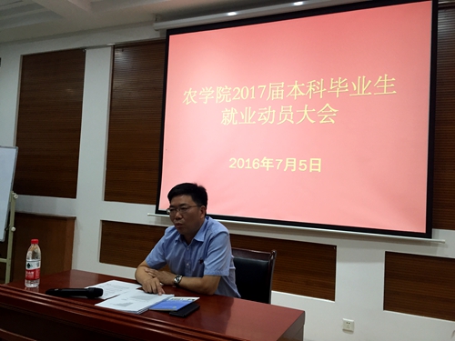 为及时总结工作经验,主动把握就业工作时机和规律,不断提升就业工作成效,农学院7月5日在就业指导中心招聘厅召开2017届毕业生就业动员大会。就业指导中心主任胥耀平、农学院党委书记惠安堂、全体2017届毕业班班主任和本科毕业生参加了动员大会。会议由学院党委副书记、副院长张海成主持。