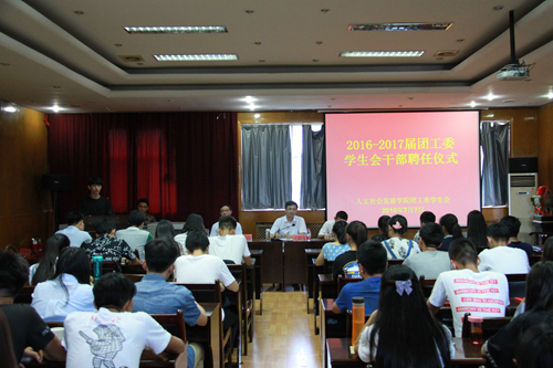 在嘹亮的团歌中,大会拉开序幕。学院党委副书记常振山宣读了聘任决定。张永斌、常振山、王德连分别为团工委学生会各部部长和主席团成员颁发聘书。学生会主席王可心在发言中谈到:新一届学生会是承前启后的一届,更是开拓创新的一届,在继承优良传统的同时,要搭建新的舞台,开创新的局面,努力使学生会的工作提升到新的水平。