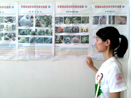 上午,队员们兵分两路,一队查阅果病相关资料,一队来到植物保护站,咨询苹果主要病虫害种类及相关的防治措施。队员们了解到危害最为严重的是蚜虫,其次为苹果腐烂病,苹果轮纹病,苹果斑点落叶病,苹果叶螨等。针对这些病虫害,目前大力推广的是绿色防控技术,包括诱集技术,以虫治虫技术,农药减量技术和生物农药使用技术。这些减毒低毒技术绿色环保,更有利于实现生态平衡。