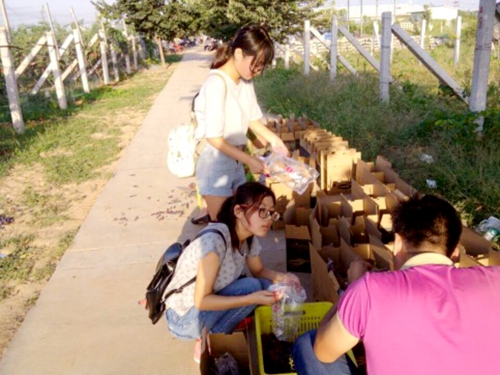 随后我们帮丰达合作社的叔叔们将压缩的箱子展开塑形,把葡萄去除坏掉部分、装袋并扎口,然后装箱,一串串玲珑剔透的葡萄华丽的变身为成箱的高端礼品。我们按这个流程忙碌着,看到一箱箱的葡萄在我们面前垒起过秤,心中有说不出的喜悦。叔叔们也询问了队员们学习、生活的情况,讲了许多农资行业的知识和信息,队员们都觉得收获很大。