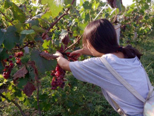 跟随着合作社工作人员,我们来到了陕西新世界果业集团采摘园内。在阿姨的悉心指导下,队员们掌握了如何选取成熟的葡萄和摘葡萄的要领。进入葡萄园之后,我们都被葡萄园结的紧密而又饱满的串串葡萄吸引了。一串串葡萄果实挂满枝头,红果黑果绿叶,非常诱人。我们在低矮的葡萄园里穿梭,寻找着熟透的葡萄串,不一会葡萄就装满了几大箱,我们将它们搬了出来,丰收的喜悦洋溢在每个人的脸上。