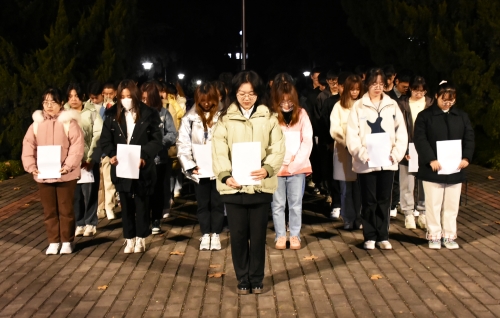 当天下午18点30分,三院社会实践部志愿者们在北校区三号教学楼前集合,进行国旗下主题朗诵。在诵读声中,西农学子们铭记历史,勿忘国耻,振兴中华,吾辈自强的理想信念越发坚定。随后,全体同学默哀三分钟,向革命先烈表达了缅怀之情。