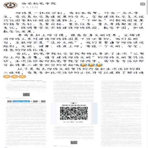“网络是一把双刃剑,有利也有弊”。互联网是坚持我国舆论风向导论的重要阵地,身为一名大学生,养成良好上网习惯,提高自身文明修养,正确使用网络工具是十分必要的。为在严峻的网络个人隐私泄露风险及网络安全形势下增强大学生的网络安全意识,使大学生从内心里更加关心国家和世界命运形势,更加健康、全面的发展,助力构建网络强国。机电学院分团委社会实践部特于2022年3月19日-21日期间举办了此次网络文明宣传活动。