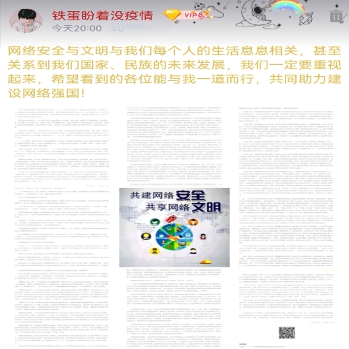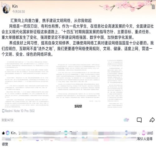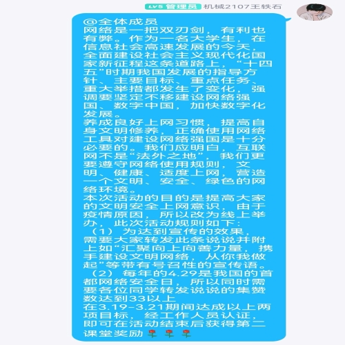 活动一经举办,便有许多同学积极响应号召并报名参与,其中多名同学发出了“汇聚向上向善力量,携手建设网络文明”的倡议,在浏览同学们的宣传内容时,一位同学由衷的写道:“网络安全与文明与我们每个人的生活息息相关,甚至关系到我们国家、民族的未来发展,我们一定要重视起来,希望看到的各位能与我一道而行,共同助力建设网络强国!”肺腑之言,感人至深,深深的鼓舞到了他的朋友与家人们。