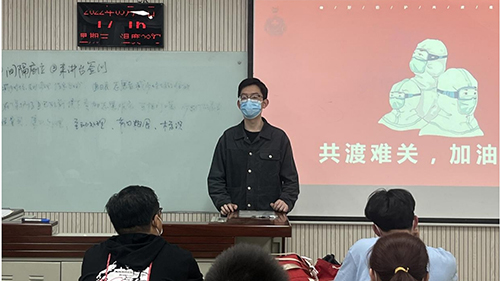 本次学习会的最后,2021级辅导员秦一郎老师对当下学校的政策解读并说明了疫情防控注意事项,结合校内与疫情相关案例,对全体同学提出口罩常态化和禁止聚集等要求,并提出几条建议:保持良好的生活作息和习惯,加强锻炼,强健体魄、提高免疫力;封校期间,和家人保持联系,多沟通,及时向家中报平安,防止父母担心;注意疫情期间的心理健康问题,心理矛盾和心理纠结及时沟通交流,正视心理问题,多途径解决心理问题,及时与导员沟通或者预约心理咨询室进行交流。