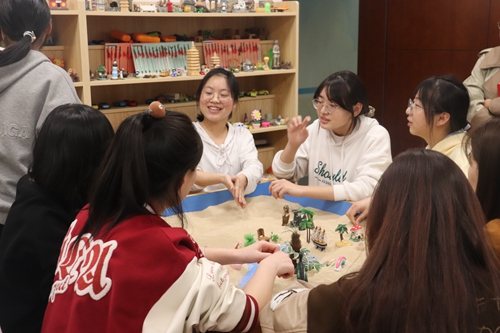 一盘细沙,一瓶清水,各式各样的沙件造型……同学们在老师的引导下,在众多的沙件造型中找到自己最喜欢的,依照自己的想法摆到沙箱里。一沙一世界,每一件沙具都是摆放者自身的投射,通过沙盘游戏同学们打造了一个简单而丰富的心理世界,将自己的心理冲突或者矛盾展现出来,逐渐形成一幅反映内心世界的沙盘作品。活动第二阶段,每位同学就自己的作品进行介绍,互相展开深入的交流与探讨,分享内心的想法,通过这样的方式同学们释放了内心压力,化解了心理冲突。