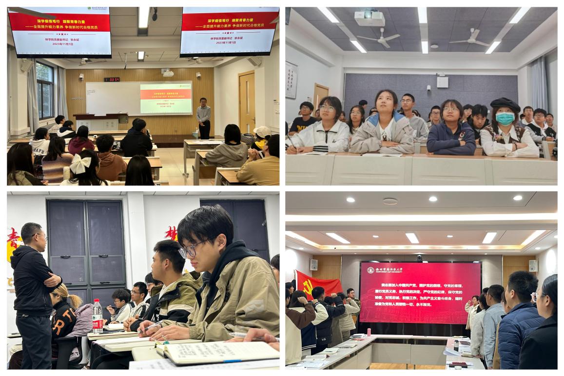 开展团员和青年主题教育必须把加强理论学习贯穿始终,学院以学习渠道多元化为指引,通过开设主题团课和微党课、举办专题讲座、开展政治理论学习、重温红色影片等多种途径,通过“林院青年”公众号、青年大学习、学习强国等多个平台,开展一系列主题教育活动,达到多平台、多渠道、立体化强化思想引领的效果。院党委副书记张永斌以《深学细悟笃行,凝聚青春力量——全面提升能力素养,做好新时代合格团学干部》为题引导团员和青年深学细悟笃行习近平新时代中国特色社会主义思想,院团委书记王博馨以《大学生干部作风建设与廉洁修身》为题为学骨干开展专题团课。学院举办“铸牢中华民族共同体意识教育”讲座、“老教授报告团”助力新生入学教育报告会、“亮身份·践承诺·树形象”主题实践活动启动仪式,促进党员干部主动亮身份亮责任、亮承诺、亮作为,以“红色引擎”激发内生动力,切实强化学院思政教育工作,增强思政铸魂育人实效性。